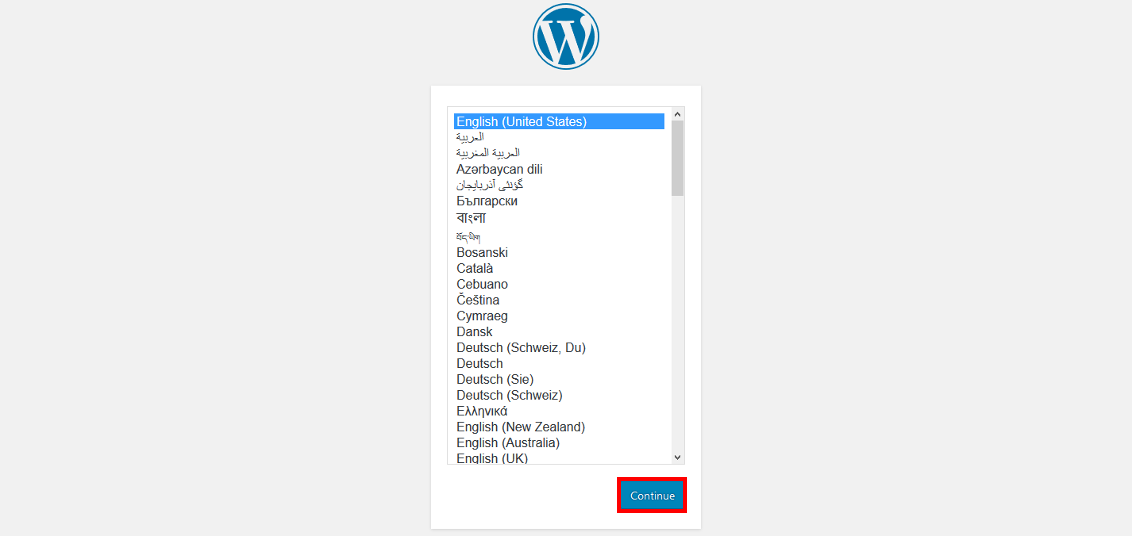 7. Open in your browser the following address: http://your-domain.com/ and you will see the beginning of WordPress installation. Choose you language and click "Continue":