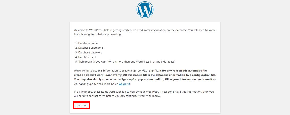 8. In our case we have created database in PhPMyAdmin and now you may click "Let's go!":